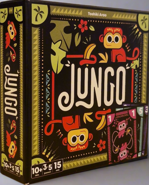 Jungo is a hand-building game in which you try to be the first player to get rid of your cards. From a deck of 64 cards, with eight copies each of 1-8, players get a hand of cards that they cannot rearrange. The starting player leads a card or set of cards with the same value but they can play multiple cards only if the cards are adjacent to one another in their hand. If cards have been played on the table, to play you must play the same number of cards with a higher value or a larger set of cards, e.g., 2 5 3,3 6,6 2,2,2 1,1,1,1. When you overplay someone, you can pick up the cards you beat and add them to your hand where you wish, or you can discard them. If you cannot or choose not to play, you must pass, drawing a card from a facedown pile; each card has two values on it, e.g., 1/2 or 5/6, and can be played as either number. You either add this card to your hand where you wish, discard it, or calling on the law of the jungo play it immediately as part of a combination from your hand that beats what`s on the table. If all but one player pass, clear the table, with the player who last played leading to an empty table. Whoever first empties their hand wins!